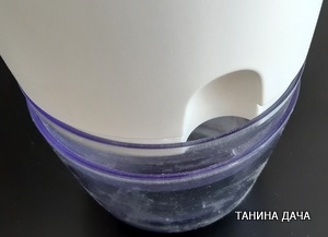 Таким образом, грунт в верхней части постоянно влажный. Рекомендуется доливать воду, чтобы она находилась в нижней емкости постоянно. Грунт не переувлажняется, так как он не забирает воду из фитиля, когда нет в этом необходимости, т е он влажный. В дне верхней емкости есть отверстия для дренажа и два отверстия, в которые вставляется фитильный шнур. Для того, чтобы долить воду в нижнюю часть емкости, в верхней части есть отверстие. Удобно наливать воду в это отверстие мерным стаканчиком для парового утюга.
