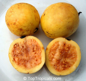 Здесь в Волгограде продают сеянцы гуавы полученные от своего же плода, созревшего в квартирных условиях. Судя по фоткам, это плод с красной мякотью. Они кислее чем гуавы с белой/желтой мякотью. Я, кстати ел только последние. Хочу приобрести, только пока в Волгоград не собираюсь, дел там нет. А так, представьте, то уже не первое поколение комнатной гуавы. Так и сорта свои скоро появятся.